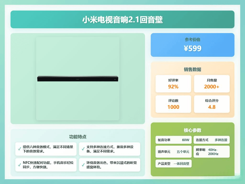 如果你对音质有更高的要求,小米音响2.1回音壁绝对值得考虑。这款音响拥有五个发声单元,峰值功率高达120W,低音效果震撼,能带来影院级的视听享受。