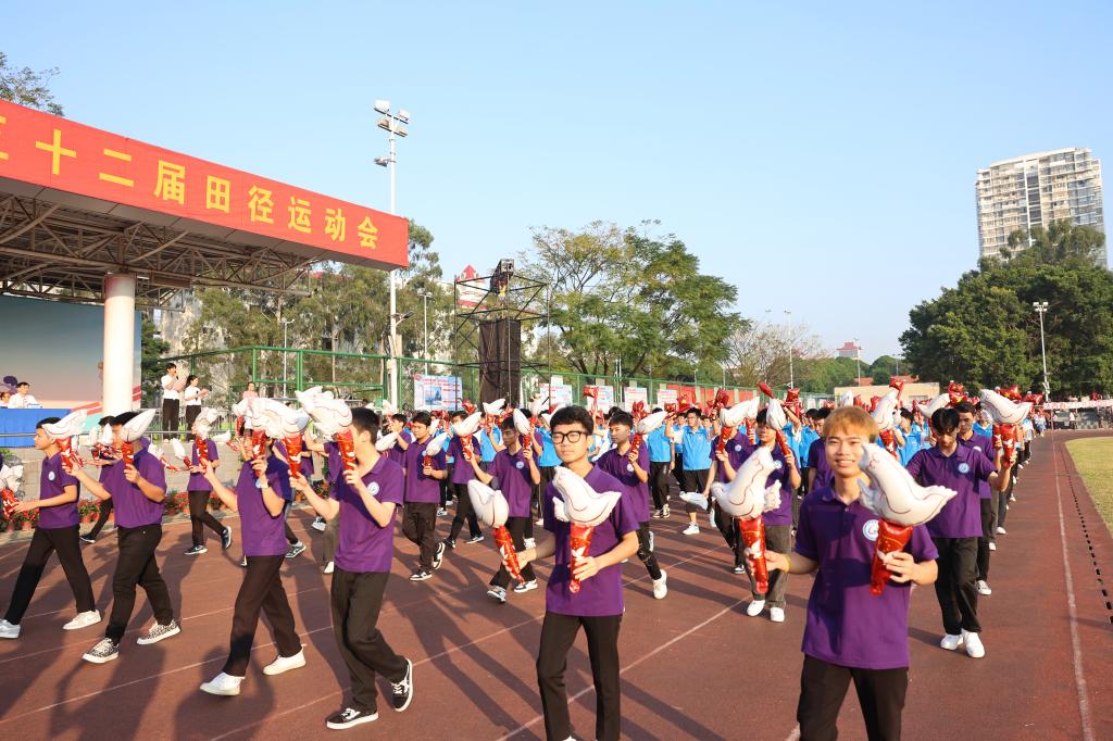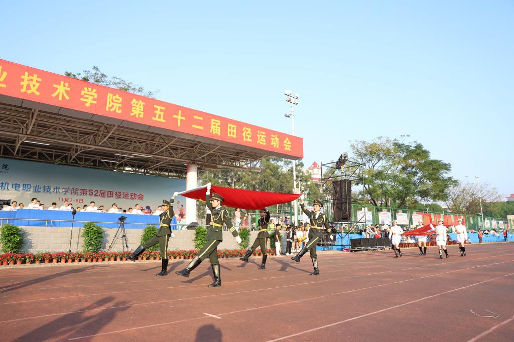 五星红旗在雄壮的国歌声中冉冉升起,伴随着激越的运动员进行曲,国旗、校旗护卫方队踏着整齐划一的步伐率先经过主席台接受检阅,裁判、教师、各二级学院代表队紧随其后入场,来自越南、老挝和泰国的留学生们也加入了今年的代表队中。他们喊着铿锵有力的口号,迈着矫健的步伐进入运动场,展现了机电师生奋发昂扬的精神面貌。