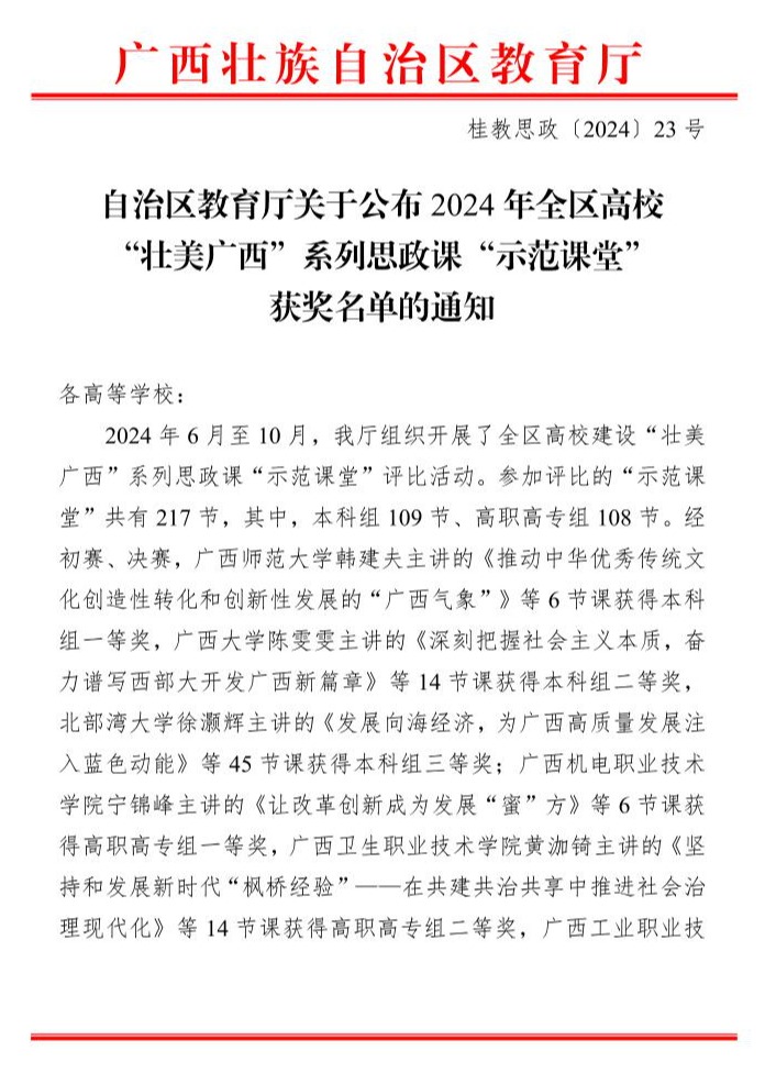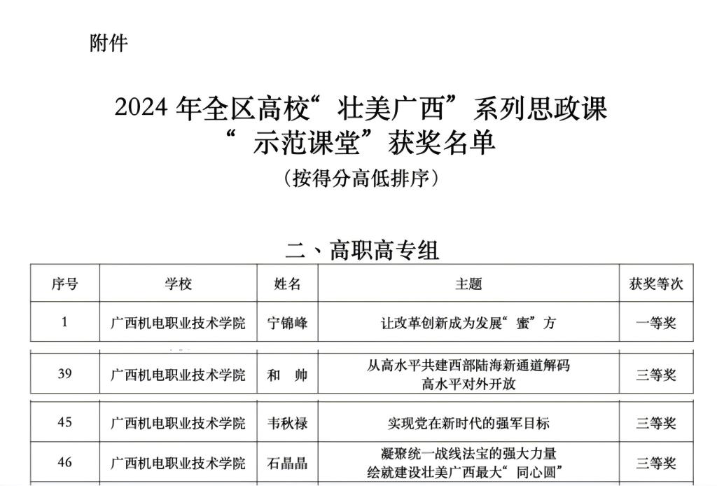 近日,自治区教育厅公布了2024年全区高校“壮美广西”系列思政课“示范课堂”获奖名单,taptap官网荣获“示范课堂”一等奖1项、三等奖3项。