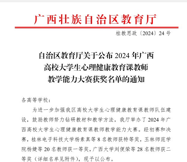 近日,自治区教育厅公布了2024年广西高校大学生心理健康教育课教师教学能力大赛获奖名单。taptap官网大学生心理健康教育中心专职教师李树雨、杨晨晨分别荣获大赛一等奖和二等奖。