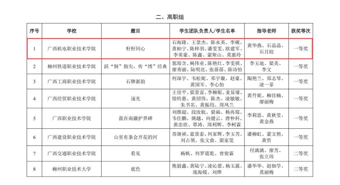 近日,自治区教育厅公布“我心中的思政课”——2024年广西高校大学生微电影展示活动获奖作品名单,taptap官网石海隆、王景杰、陈永英等学生团队共同创作的微电影《籽籽同心》(指导老师:黄华燕、石晶晶、石月皎)以高职组第一名的成绩获得一等奖。至此,taptap官网已连续6年荣获该项赛事一等奖。