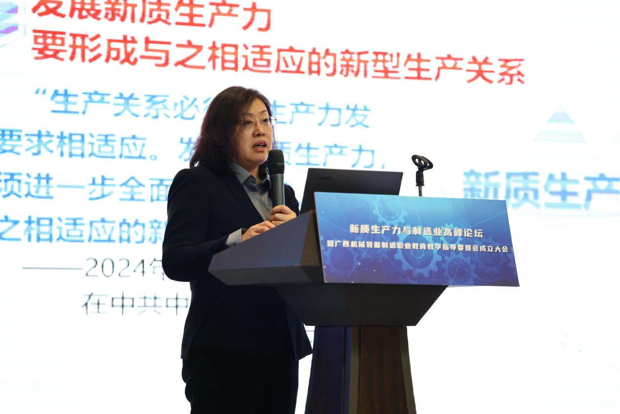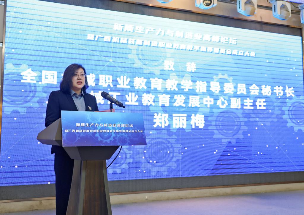 郑丽梅在致辞中表示,成立广西机械装备制造职业教育教学指导委员会,是贯彻落实习近平总书记关于“构建职普融通、产教融合的职业教育体系,大力培养大国工匠、能工巧匠、高技能人才”重要指示精神的积极探索和有益实践,是推动职业教育发展的有力措施,对广西装备制造业的发展,有着重要意义。她向广西机械装备行指委的成立表示衷心的祝贺,希望机械装备行指委发挥行业在职业教育教学和质量提升中的指导作用,深化产教融合,推动多方合作,构建适应新质生产力需求的产教协同育人新格局,为行业高质量发展和地方经济建设提供新动能。