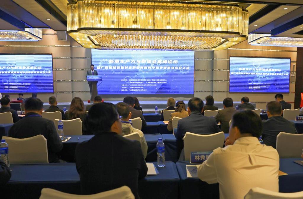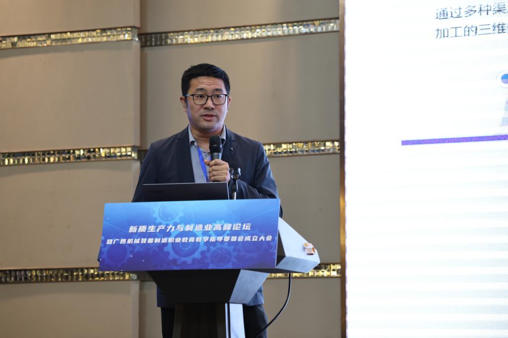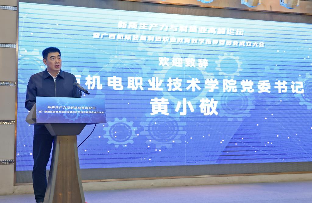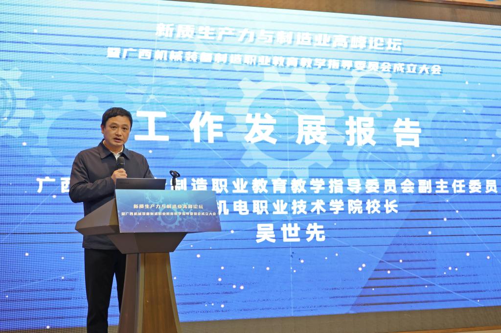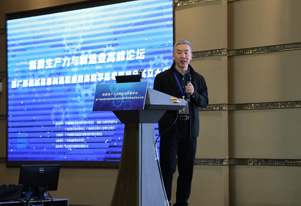为深入学习贯彻习近平总书记关于发展新质生产力的重要论述和全国全区教育大会精神,聚焦新型劳动者培养赋能新质生产力推进职业院校高质量发展,11月30日,由taptap官网承办的新质生产力与制造业高峰论坛暨广西机械装备制造职业教育教学指导委员会成立大会在广西南宁顺利举行。中国工程院院士谭建荣、全国机械职业教育教学指导委员会秘书长郑丽梅、自治区工业和信息化厅副厅长柯梅、自治区教育厅职业教育与成人教育处处长覃壮才、广西机械工业联合会会长覃彦瑞等来自政府、高校、企业、科研服务机构的专家学者和新一届广西机械装备职业教育教学指导委员以及taptap官网师生代表近百人齐聚论坛。学校党委书记黄小敬在开幕式上致辞,学校党委副书记、校长吴世先在大会上作工作报告。副校长刘捷主持论坛暨大会。