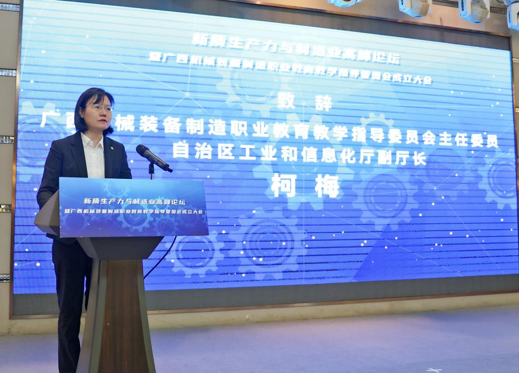 柯梅在致辞中表示,当前广西发展,期望大好、机遇大好、前景大好。机械装备制造发展迎来加速发展的重大窗口期,也为职业教育发展提供了宏大场景。机械装备行指委的全体委员,要充分认识成立机械装备行指委的重要意义,用好用足广西大发展的宏大场景,将机械装备行指委建成服务区域发展的“蓄能池”、产业升级的“加油站”和企业发展的“充电桩”,助推机械装备产业高质量发展,为加快推进新型工业化,奋力谱写中国式现代化广西篇章作出新的更大贡献。