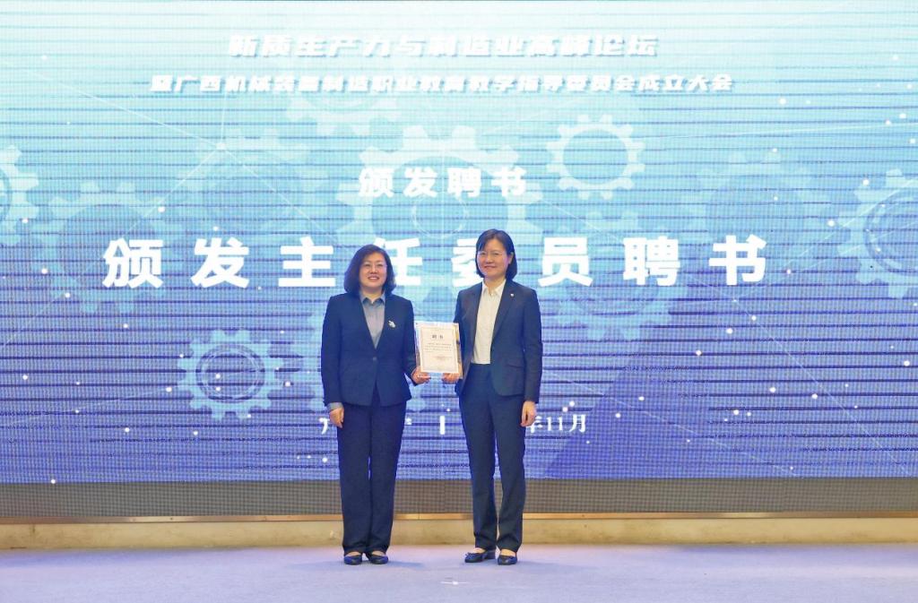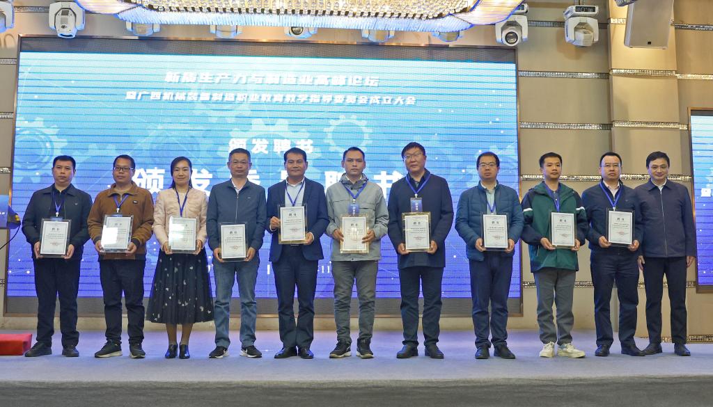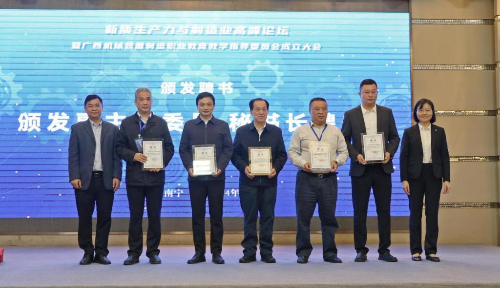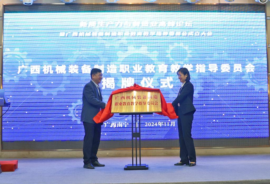 会上举行了广西机械装备制造职业教育教学指导委员会成立暨揭牌仪式,柯梅和覃壮才共同为广西机械装备制造职业教育教学指导委员会揭牌,郑丽梅和柯梅分别为主任委员、副主任委员、副秘书长和各委员颁发了聘书。