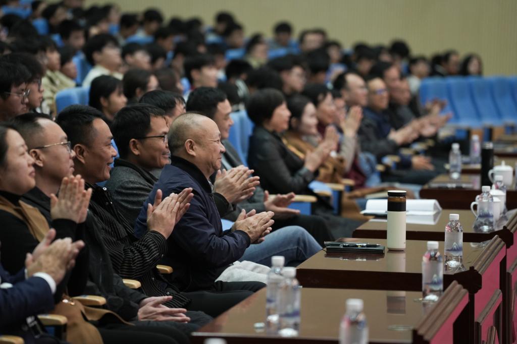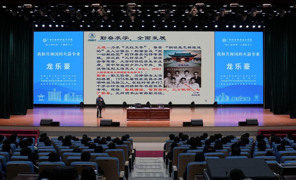 学校领导在主持时表示,龙乐豪院士的报告会是一场感悟思想伟力的学习报告会,更是一堂带着同学们筑梦“星辰大海”的思政课。党的十八大以来,习近平总书记一直高度重视我国航天事业的发展,多次发表重要讲话,为建设航天强国指明了方向。借助龙院士的报告会,我们进一步深刻感悟思想伟力,奋力推进航天强国、科技强国、教育强国建设的信心更加坚定、目标更加明确、步伐更加有力。这两场报告会也是一场赓续红色血脉、激励实践报国的报告会。我们要从龙院士的榜样事迹中深刻领悟到深厚的“家国情怀”,将“特别能吃苦、特别能战斗、特别能攻关、特别能奉献”的载人航天精神融入学习生活中,秉承“自强弘毅,知行合一”的校训,将学习成果转化为技能报国的实际行动,用青春行动涵养“自找苦吃”的精神品格,以创新与实干争做建设制造强国的栋梁。