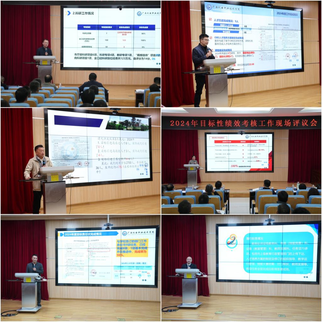 评议结束后,校长吴世先对各部门单位在2024年所取得的工作成效给予了高度评价。他用“高、新、融、难、顺、实、稳”七个字高度概括了学校一年的工作。一是各部门单位签订的责任书目标高、任务完成度高、成绩亮眼,如全口径科研经费893万、社会服务到账额1051万等,彰显发展强劲动力。二是取得新突破、挺进新领域、展现新面貌,首获国家级在线精品课程、国家自然科学基金项目、广西自然科学基金项目和国际学生招生资格,成为广西高职院校首个国家自然科学基金依托单位,开启邕江两岸双校区办学的新纪元,校园风貌焕然一新。三是进一步加强了产教融合、校企融合、校院融合,学校深度融入广西工业振兴三年行动计划,与南宁产投等企业紧密合作实现办学资源扩容、社会服务能力升级,各二级部门将本单位工作与学校利益紧密融合。四是直面OBE人才培养模式改革、数据治理、学校治理等难关,抱着不达目的绝不收兵的坚定决心,已经初见成效。五是学校工作渐入顺境,各部门服务意识增强让师生办事更顺,配合“一规范两提升”工程的47项新教学制度和高标准重构的科研工作体系让教学科研管理更顺,人事、绩效制度组合拳让师生干事创业热情高涨、心气更顺。六是全体教职工秉承求实作风,干出了实绩,得到上级部门的高度肯定。七是校园安全稳定、和谐有序。