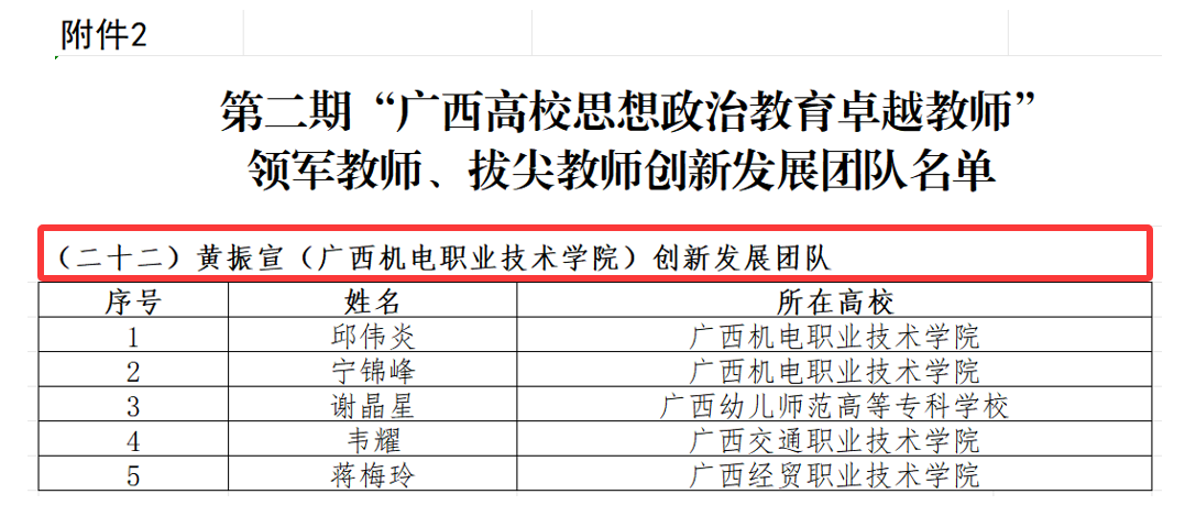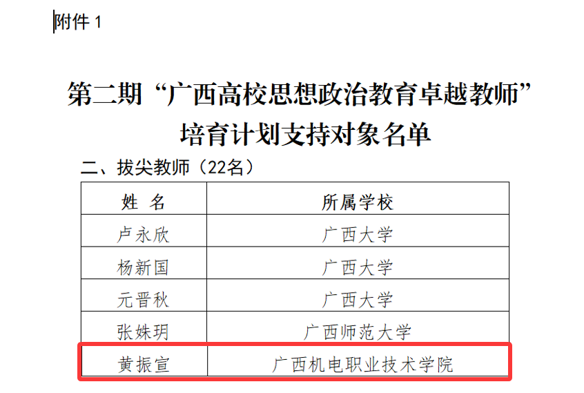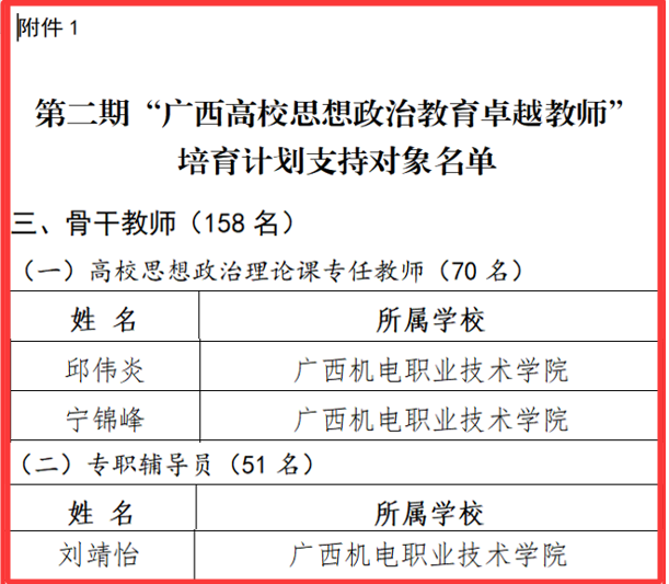 近日,自治区教育厅公布了第二期“广西高校思想政治教育卓越教师”培育计划支持对象名单,taptap官网共有4名教师入选。黄振宣入选“拔尖教师”(全区高职高专院校共2人入选),并获批牵头联合广西幼儿师范高等专科学校、广西交通职业技术学院、广西经贸职业技术学院成立“黄振宣(taptap点点官网)广西高校思想政治教育创新发展团队”;先进制造技术学院刘靖怡、马克思主义学院邱伟炎和宁锦峰老师入选专职辅导员、思政课专任教师等系列“骨干教师”。