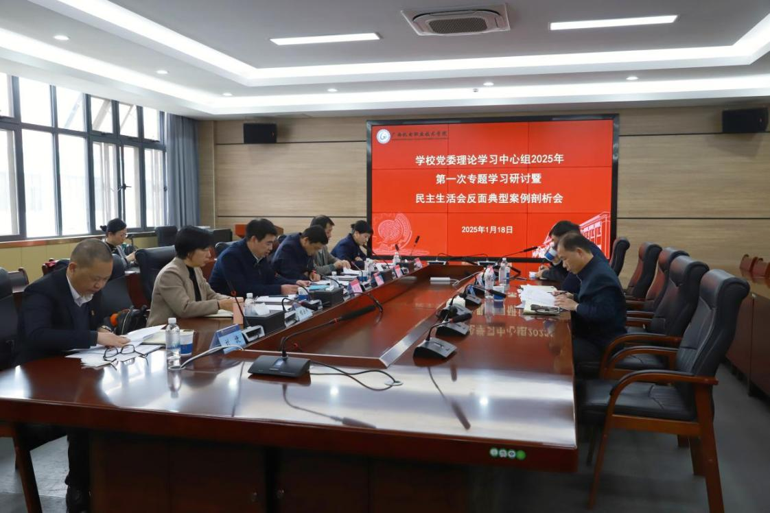 1月18日,学校党委理论学习中心组在笃行楼507会议室召开2025年第一次专题学习研讨暨反面典型案例剖析会,深入学习领会习近平新时代中国特色社会主义思想,一体学习贯彻习近平总书记关于党的建设的重要思想、关于党的自我革命的重要思想和关于党的纪律建设的重要论述,学习领会习近平总书记在中共中央政治局民主生活会和二十届中央纪委四次全会上的重要讲话精神,按照2024年度民主生活会要求,结合典型案例,深入开展研讨交流,为开好民主生活会打牢思想基础。学校党委书记黄小敬主持并讲话。全体在校校领导参加学习,党政办、纪委、组织部、宣传部等单位负责人列席会议。