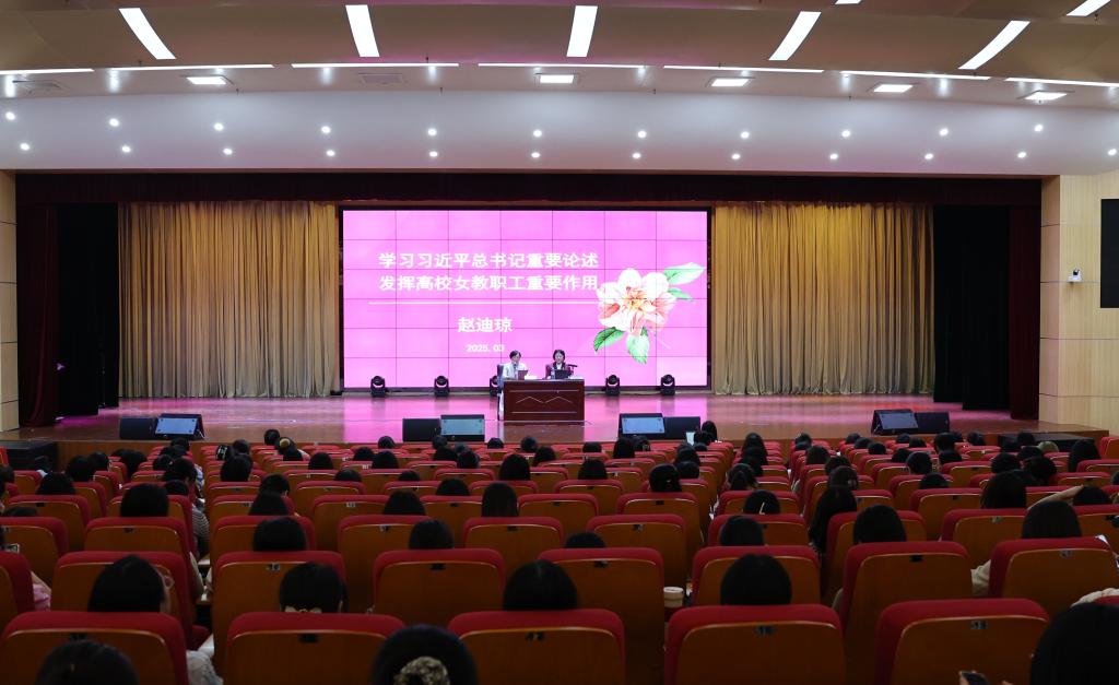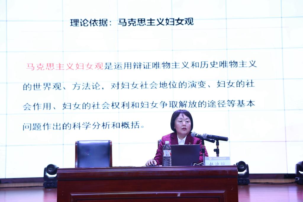 赵迪琼围绕主题从三个方面展开讲解。她详细解读了习近平总书记关于妇女和妇女工作的重要论述,指出这一论述为新时代妇女事业发展指明了方向,提供了根本遵循。她从教育、就业、参政议政等多个领域展示了妇女地位的不断提升,介绍了我国妇女事业取得的显著成就,同时分析了当前妇女事业面临的挑战。赵迪琼就如何发挥高校女教职工的重要作用提出了建议。她鼓励女教职工在教学、科研、管理服务等岗位上充分发挥自身优势,以更加饱满的热情和昂扬的斗志投身到学校的建设和发展中,为培养德智体美劳全面发展的社会主义建设者和接班人贡献力量。