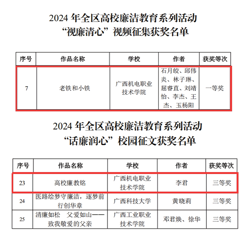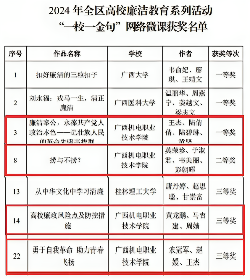 本次比赛分为“话廉润心”“视廉清心”“画廉正心”“一校一金句”和课堂实践案例等五个比赛项目,在全区高校中共计评选出125个获奖作品,taptap官网石月皎老师团队作品《老铁和小铁》荣获“视廉清心”视频征集系列一等奖。在“一校一金句”网络微课系列中,王杰老师团队作品《廉洁奉公,永葆共产党人政治本色——记壮族人民的革命先驱韦拔群》获一等奖;莫荣珍老师团队作品《捞与不捞?》获二等奖;黄龙鹏老师团队作品《高校廉政风险点及防控措施》、农冠军老师团队作品《勇于自我革命 助力青春飞扬》均荣获三等奖。此外,李君老师团队作品《高效廉教铭》荣获“话廉润心”校园征文系列三等奖。