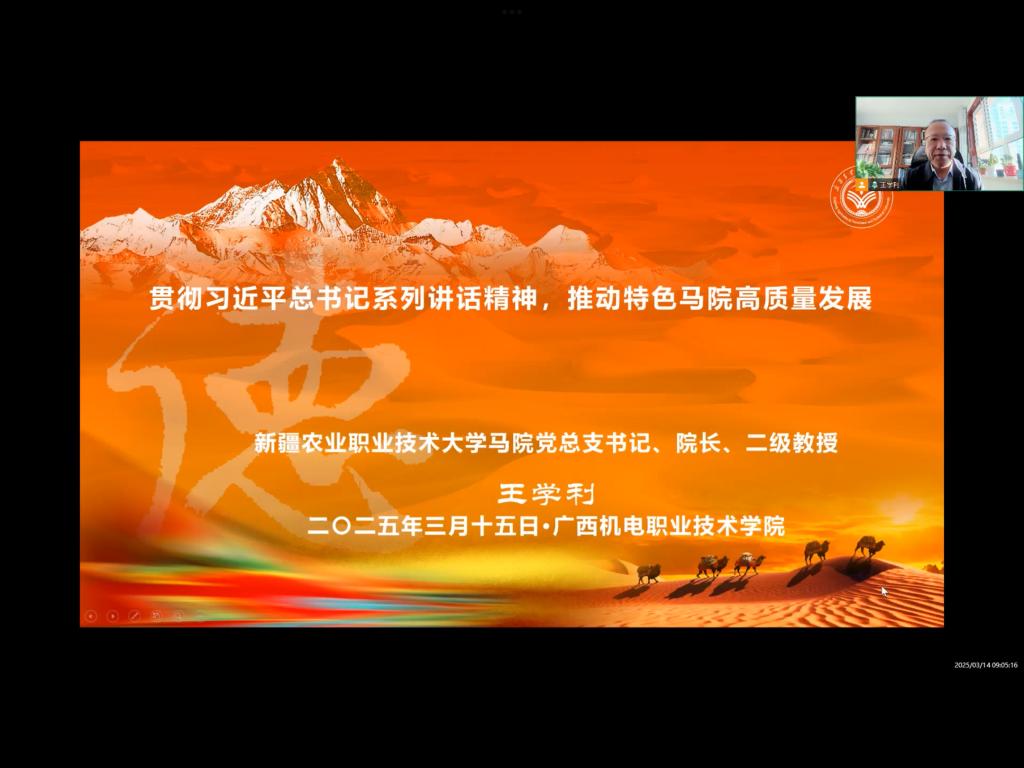 新疆农业职业技术大学马院院长王学利教授以《贯彻习近平总书记系列重要讲话精神,推动特色马院高质量发展》为题作线上报告,剖析高职马院建设的发展脉络与发展趋势,回顾习近平总书记对学校思政课建设的重要指示批示,并结合本校特色马院建设实践,分享如何推动特色马院科学发展的经验。