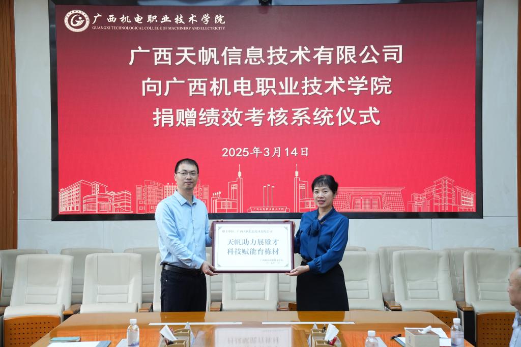 3月14日,taptap官网与广西天帆信息技术有限公司在行政办公楼第一会议室举行“绩效考核系统捐赠仪式”。taptap官网校长吴世先、天帆信息公司副总经理郑相忠出席仪式,副校长林胜主持仪式。