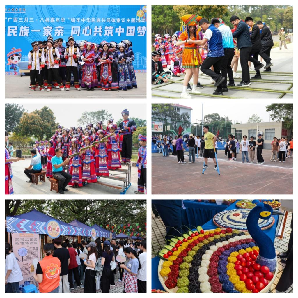 开幕式后,师生们共同来到民族文化街市品美食,体验民俗活动。据了解,本次主题活动在相思湖校区和江南校区同时进行,融合“民族风情”和“工匠特色”理念,共设民俗文化街市、山歌对对唱、少数民族传统体育运动会等活动板块,通过品尝五色糯米饭、艾叶糍粑等壮乡民族特色美食、体验团扇、书签、扎染等非遗文化民俗工艺品制作、投壶、套圈、花艺、茶艺等全新文创+游戏体验、山歌对唱、竹竿舞、高杆绣球、高脚马竞赛等文体项目,不仅让广大师生尽情领略到“三月三”民族文化魅力,全方位、多领域感受八桂壮乡的“最炫民族风”,进一步强化民族团结理念,也让在校学习的越南留学生和泰国代表团感受壮乡人民的欢乐与热情,感受中国文化魅力。