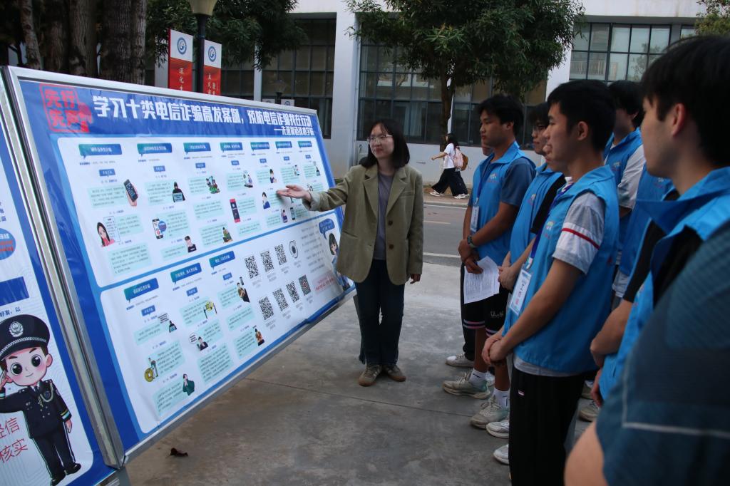 学校与属地公安机关紧密合作,形成反诈合力。保卫处联合警方组织反诈安全宣传教育“进校园”活动,师生与民警共同探讨虚拟货币诈骗、AI换脸诈骗等新型犯罪防范策略,并深入学生宿舍与学生探讨如何识别跨境诈骗、虚拟货币诈骗等新型犯罪,加强反诈宣传教育。