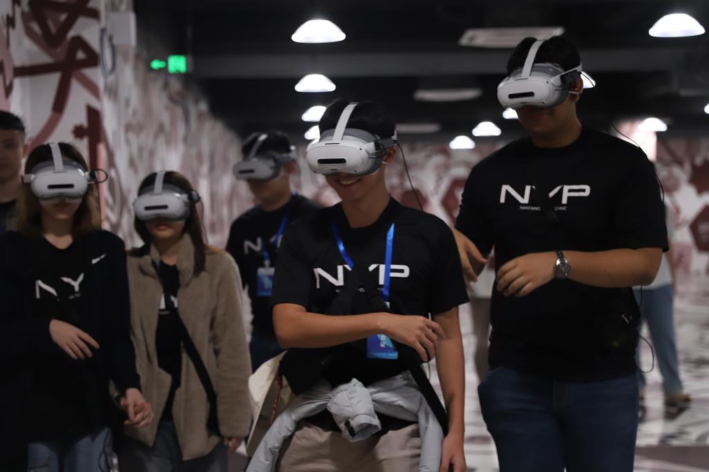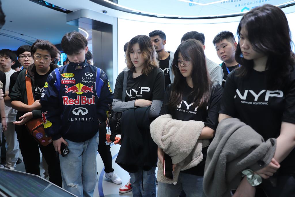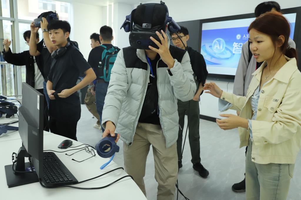 在taptap官网江南校区人工智能技术学院内,研学团师生们参观了人形机器人编程、元宇宙虚拟实训等场景,体验了“数字孪生+职业教育”的前沿模式。