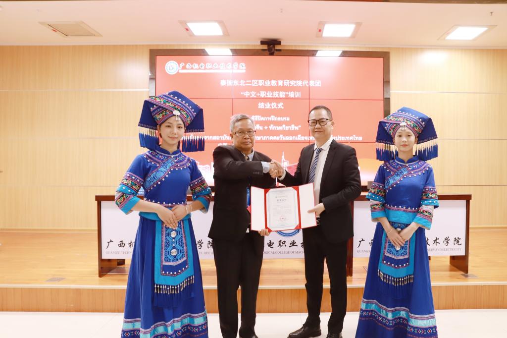 在热烈的掌声中,刘捷为泰国学员逐一颁发结业证书,并合影留念。他表示,学校将以此次培训为契机,持续拓展中泰教育共同体建设,通过人才联合培养、技术协同创新等机制,夯实“一带一路”职教合作根基,为区域经济发展贡献智慧和力量。