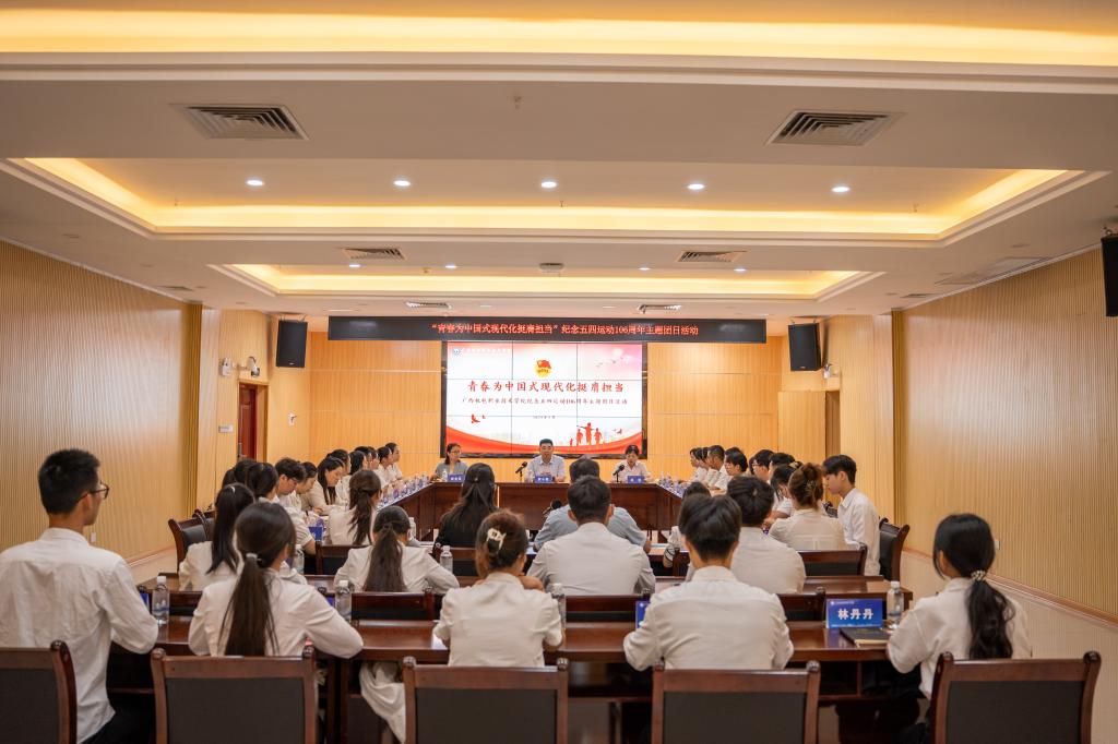 校党委书记黄小敬在活动上向全校团员青年致以节日的祝贺和亲切的问候,向全校共青团干部和致力于青年发展事业的老师们表示衷心的感谢。他与大家一起学习了习近平总书记给谢依特小学戍边支教西部计划志愿者服务队队员的重要回信和在《求是》上发表的重要文章精神,重温了习近平总书记对青年的殷殷寄语,围绕主题与大家共同探讨了如何做有理想、敢担当、能吃苦、肯奋斗的新时代机电好青年,弘扬五四精神,以挺膺担当的青春之姿为奋力谱写中国式现代化广西篇章作出贡献。
