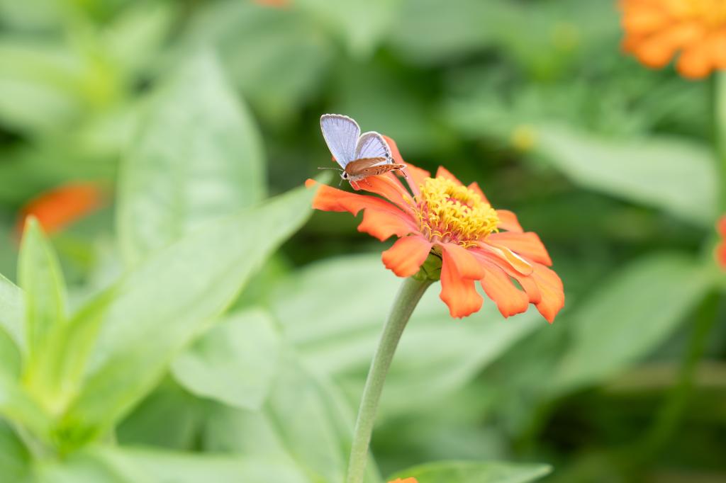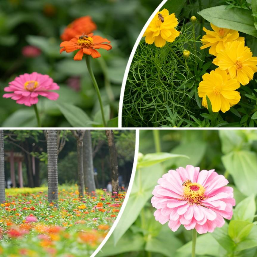 花田里,百日菊色彩明艳,从橙红到明黄,层层叠瓣于阳光下恣意舒展,仿若跃动的火焰;格桑花随风轻舞,粉紫和浅白相间的花瓣摇曳生姿,尽显灵动之美。两种花卉错落相映,勾勒出如诗如画的自然生态画卷。
