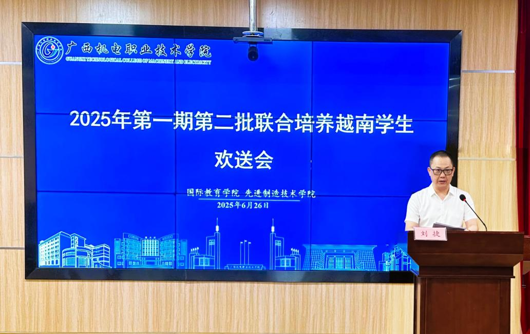 刘捷在致辞中向圆满完成学习任务的同学们致以热烈祝贺。他指出,学校举办“校-企-校”中越联合培养“中文+技能”项目,是学校推进“职教出海、教随企出”的重要成果,更是深化中越职业教育合作的关键实践。通过半年的朝夕相处,两国师生不仅实现了专业知识的互鉴共进,更以心相交,生动诠释了“中越山水相连、文化相通”的深厚情谊。他殷切希望越南同学回国后,能成为中越友谊的传承者、企业发展的助力者、终身学习的奋斗者,以智慧和汗水为中越两国发展及人类进步事业贡献力量。