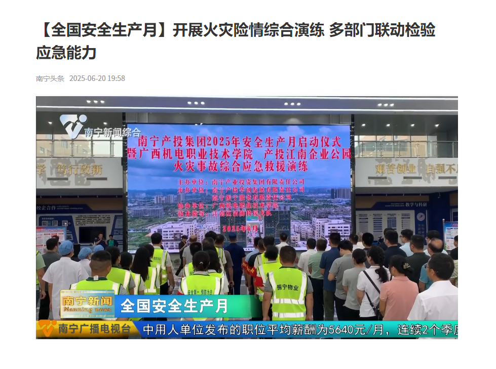 6月17日,学校联合南宁产投集团、产投江南企业公园、江南区消防救援大队在江南校区成功开展了一场沉浸式火灾事故综合应急救援演练。演练模拟教室内突发火灾事故,涵盖火灾报警、人员疏散、初期火灾扑救、伤员救治等多个环节。演练过程中,参演人员各司其职、协同配合,严格按照应急救援预案进行操作,现场秩序井然。通过这次贴近实战的演练,师生们不仅熟悉了火灾事故的应对流程,更在心理上筑起了一道“防火墙”,显著提升了消防安全意识和应急处置能力。活动得到南宁电视台报道。