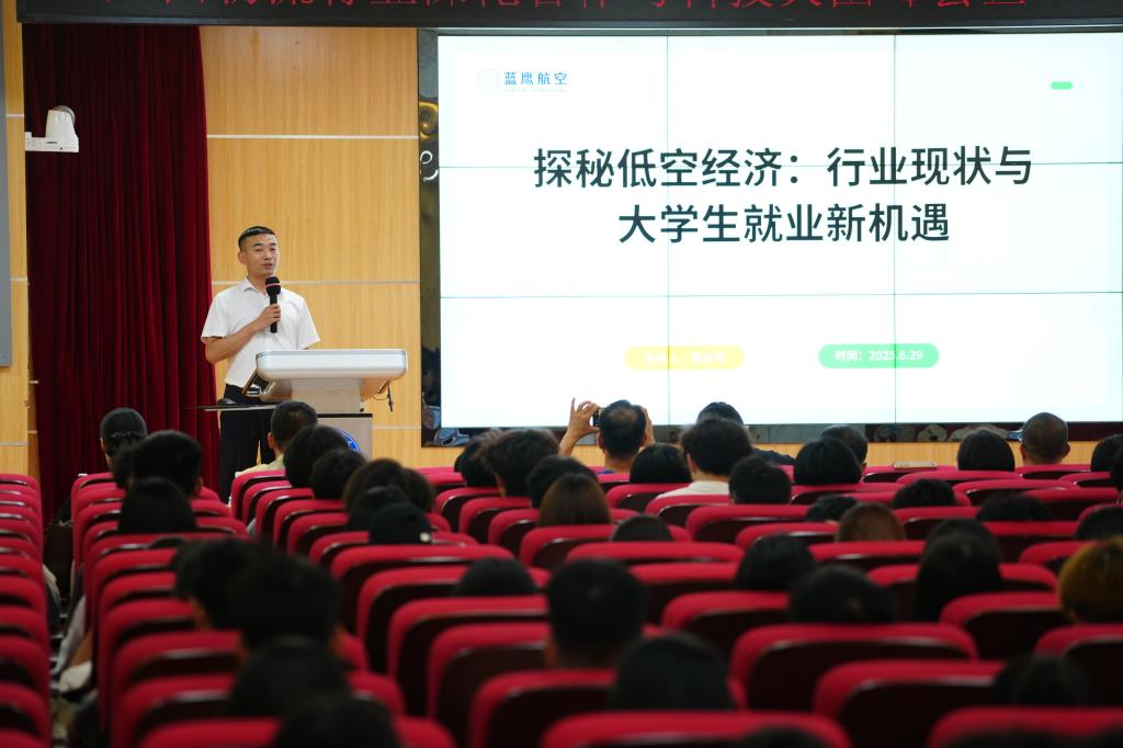 蓝鹰航空科技总经理吕总伟在《低空经济腾飞之路》的报告中,展示了无人机物流如何突破“最后一公里”的技术,介绍了无人机系统工程师、低空旅游运营专员等新兴职业,呼吁学生们关注“技术+场景”的融合能力,以适应未来职场的变化。