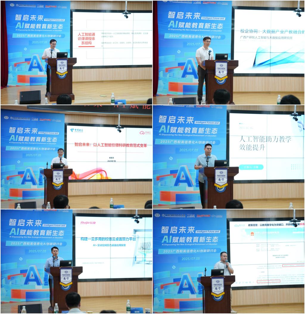 随后,多位行业专家带来了精彩纷呈的报告。taptap点点官网信息中心主任李奇国以《构建AI能力培养生态体系,赋能广西产业转型升级》为主题,详细阐述了taptap点点官网在“AI +”领域的实践探索与创新成果;广西产研院人工智能与大数据应用研究所运营发展部副总经理钮因昌作《校企协同:数据资源产业产教融合的创新合作模式》报告,深入剖析了数据行业发展趋势对人才需求的深刻影响,积极探索校企协同育人的新模式与产教融合的创新路径;中国电信集团大数据及AI首席专家侯圣文通过《智启未来:以人工智能引领科研教育范式变革》主题报告,分享了高校AI应用的典型案例,并对AI技术引领未来科研教育的发展趋势进行了展望;广西大学计算机与电子信息学院副教授白琳作《人工智能助力教学效能提升》主题报告,展示了AI技术在提升教学效率方面的具体应用案例,探讨了教师角色转型的新方向,同时提出了针对高校的实施策略与建议,并引入高校人工智能教育成果案例;锐捷网络股份有限公司专家谭正佳作《AI +实训空间云桌面报告》,详细介绍了校级云桌面算力平台概念,以及构建一云多用的校级云桌面算力平台的方法;北京智汇云舟科技有限公司专家毛士财作《智启未来:视频孪生赋能“政产学研用”深度协同》报告,阐述了视频孪生技术在当下数字化时代的关键作用,视频孪生技术作为一种创新的数字化工具,凭借其精准模拟现实场景与实时映射的能力,为“政产学研用”各环节注入了强大动力。