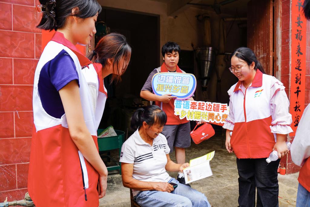 从校园到社区,实践团向村民发放推普手册,让“说好普通话,从我做起——学好用好国家通用语言文字”深入人心。