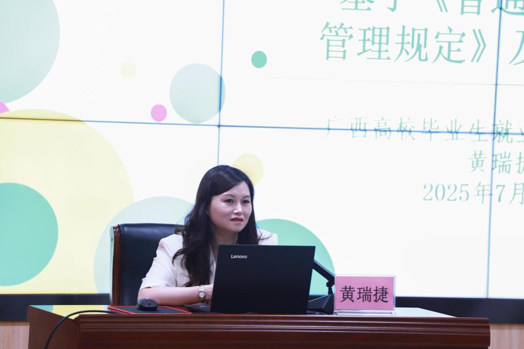 广西大学生就业服务中心主任助理、市场部部长赵敏进行了就业工作督查实例剖析与经验交流,为辅导员们在就业指导方面提供了宝贵的实战经验和策略。