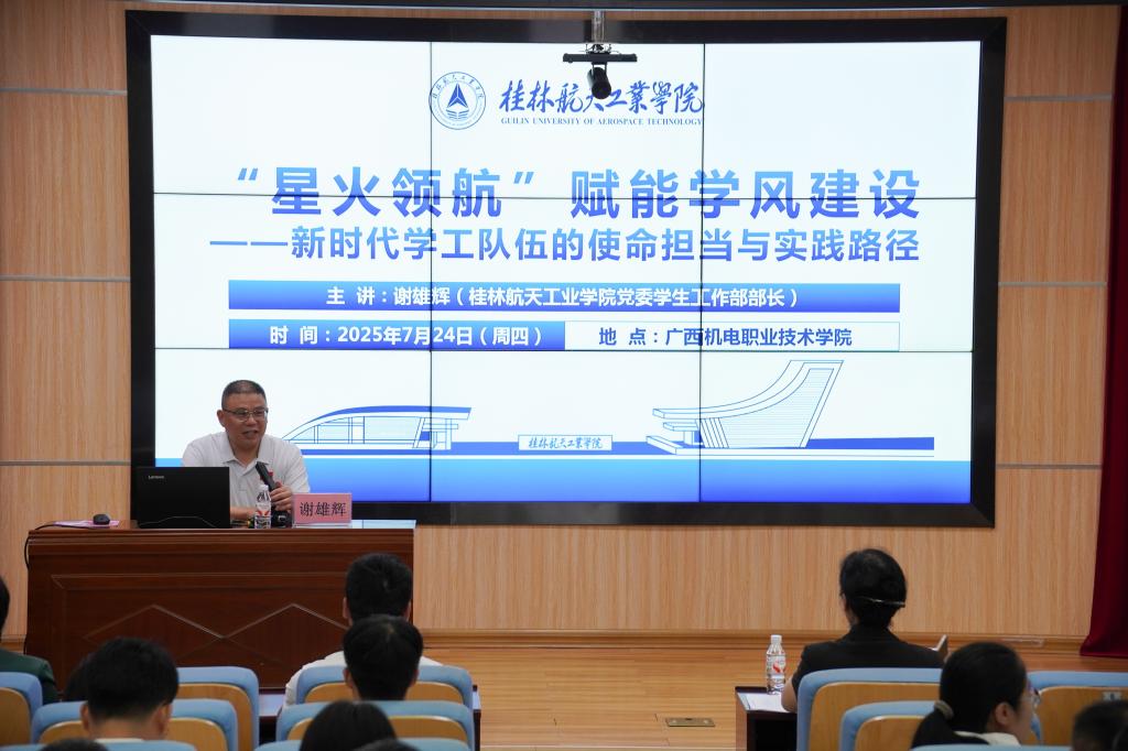 桂林航天工业学院党委学工部部长谢雄辉,以“‘星火领航’赋能学风建设——新时代辅导员的使命担当与实践路径”为主题开展讲座。他围绕学风建设“12345”模式,系统讲解其实践方略,涵盖目标设定、驱动机制等关键要点;深入剖析新时代学工队伍职业使命与核心角色;并对学工队伍作风能力建设提出时代要求,为辅导员开展学风建设工作提供了全面且实用的指引。