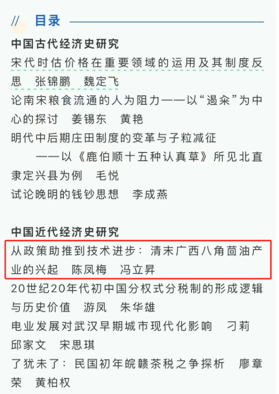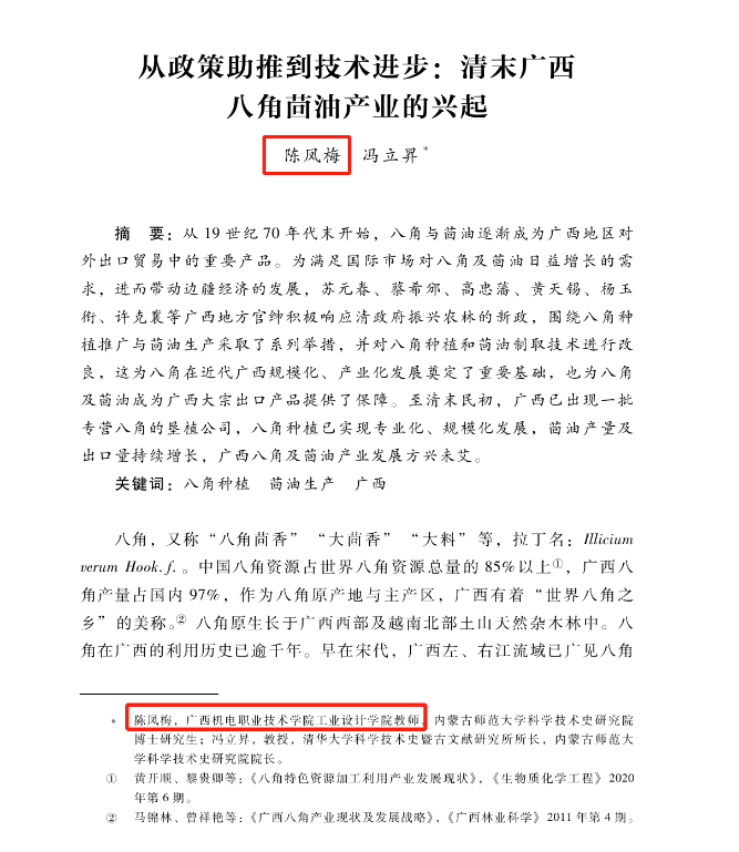 近日,taptap官网工业设计学院陈凤梅老师作为第一作者,taptap点点官网作为第一完成单位,在南京大学中文社会科学引文索引(CSSCI)来源集刊、中国社会科学院中国人文社会科学期刊综合评价(AMI)核心集刊《中国经济史评论》发表了题为“从政策助推到技术进步:清末广西八角茴油产业的兴起”的学术论文。该项研究成果的发表标志着taptap官网在“双高”建设过程中教师科研水平得到显著提升,为taptap官网在相关领域开展进一步研究工作奠定基础。