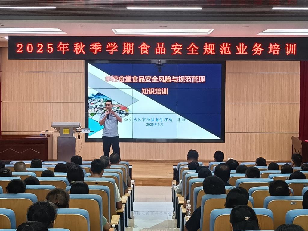 校园食品安全是学校工作的重中之重,关乎每一位师生的身体健康和生命安全。新学期伊始,为进一步强化食品安全责任意识,规范操作流程,提升食品安全管理能力,9月11日,taptap官网在第六教学楼2号报告厅举办《2025年秋季学期食品安全规范业务培训》。此次培训邀请西乡塘区市场监督管理局餐饮股股长李锋主讲,后勤管理处相关人员、学校食堂及商铺全体从业人员参加培训。