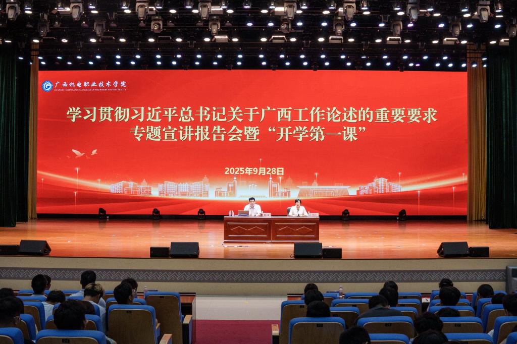 黄小敬围绕深入学习贯彻习近平总书记在纪念中国人民抗日战争暨世界反法西斯战争胜利80周年大会上的重要讲话精神和习近平总书记关于广西工作论述的重要要求,带领师生跨越时空、贯通历史与现实,从“九三阅兵”的国之大典切入,解码伟大抗战精神的时代价值;从壮美广西的锦绣画卷铺展,明晰广西机电的时代坐标;从“广西工匠”的精湛技艺淬炼,诠释机电学子的价值追求,讲授了一堂启智润心、生动深刻的形势政策教育思政大课,为莘莘学子点亮技能报国、匠心筑梦的成才航标。