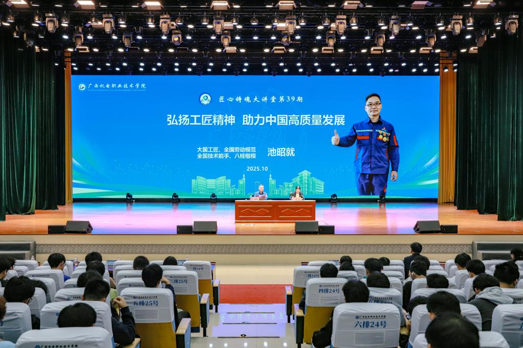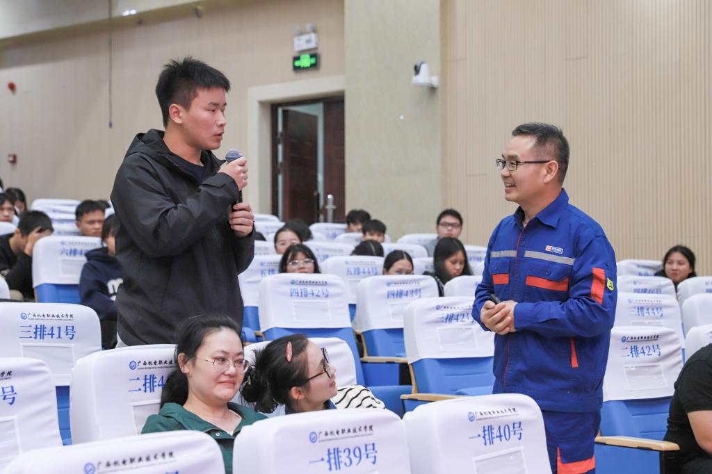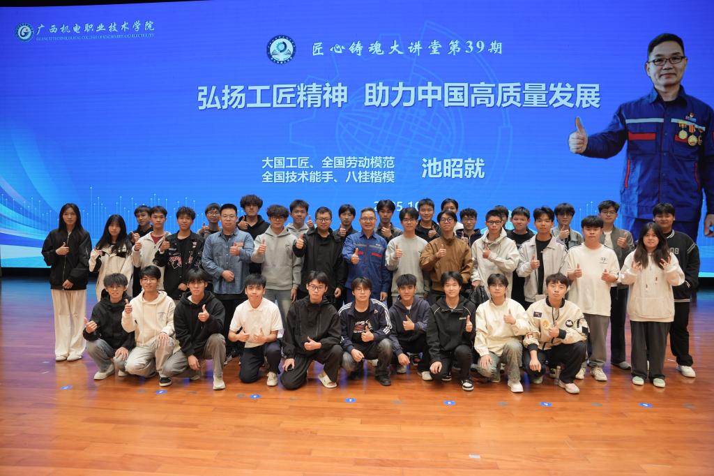 在互动环节,同学们踊跃提问,池昭就耐心解答,鼓励大家“把技能练到过硬、把根扎进产业、把创新融入日常”,寄语青年学子以技能铸魂、以实干担当,成为中国制造向中国智造跨越的中坚力量。