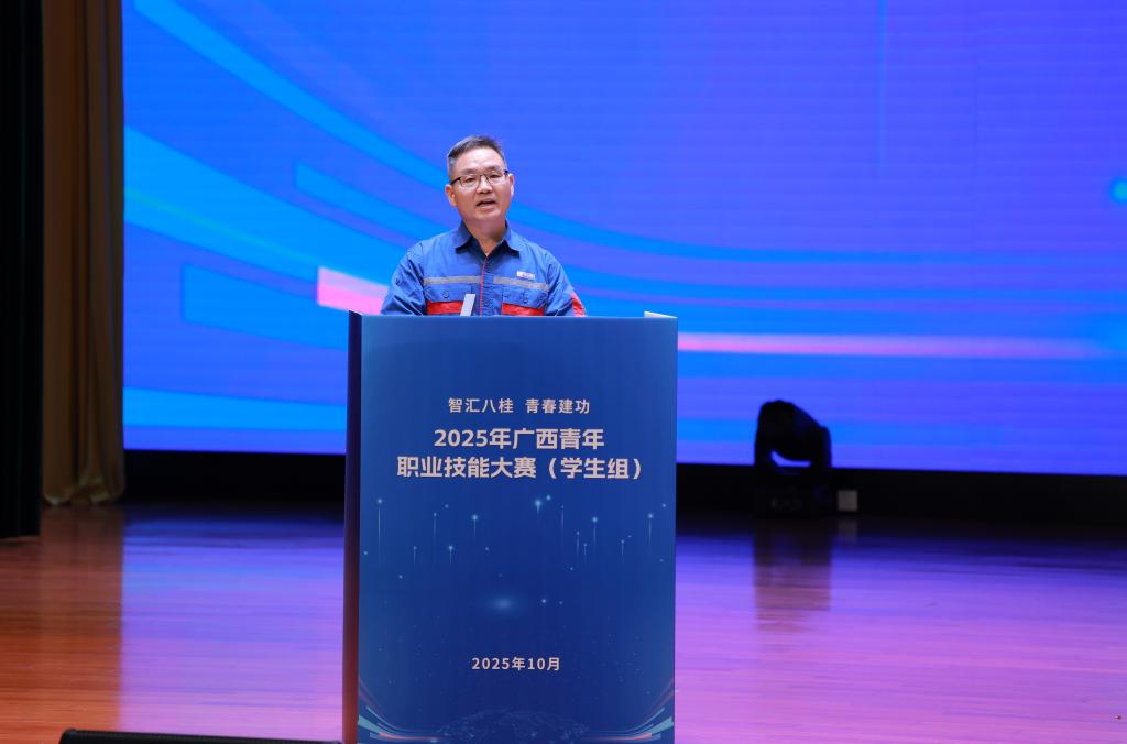 吴世先致欢迎辞。他介绍了学校持续深化人才培养模式改革、致力于培养出包括“大国工匠”“全国技术能手”在内的一批又一批高技能人才的办学实践。他指出,本次大赛设置工业视觉、人工智能等契合制造强国战略和广西“人工智能+”部署的赛项,既是对职教成果的集中展示,更是对青年技能水平的实战锤炼。他表示,作为承办单位,学校将全力做好赛事保障,营造最佳竞赛环境,助力大赛取得圆满成功。