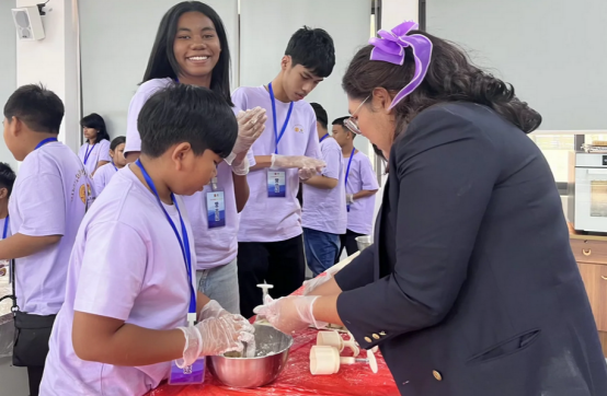 在中国传统文化体验课上,泰国师生们饶有兴致地聆听了关于团圆寓意与月饼渊源的讲解。随后的体验环节更是点睛之笔——从揉面、包馅到压模、烘烤,大家亲手实践,制作出一个个带有温度、印着吉祥纹样的月饼。这不仅是一次有趣的手工体验,更让大家深切感受到了传统美食所承载的匠心技艺与代代相传的温情。