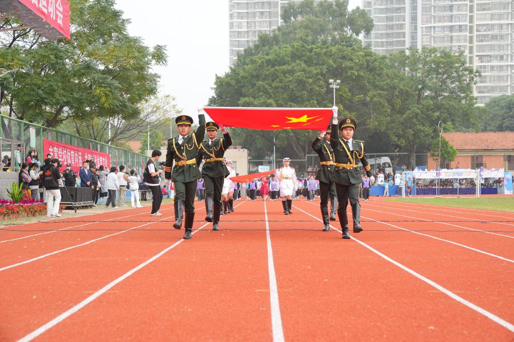 伴随着激昂的运动员进行曲,国旗、校旗护卫方队踏着整齐划一的步伐率先经过主席台接受检阅,裁判、教师、各二级学院代表队依次入场,他们精神抖擞,喊着铿锵有力的口号,迈着矫健的步伐进入运动场。
