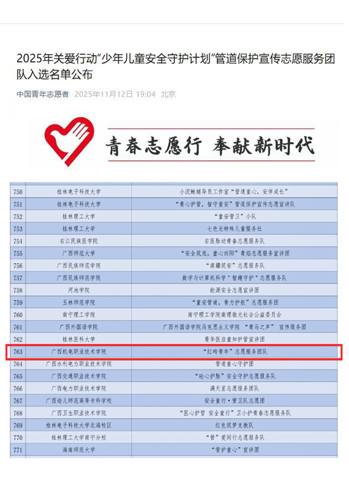 据悉,团中央青年志愿者行动指导中心联合有关单位组织开展的2025年关爱行动“少年儿童安全守护计划”管道保护宣传志愿服务团队遴选工作,面向全国高校遴选1000支大学生志愿宣讲团队,最终共有来自北京师范大学、哈尔滨工业大学、西南石油大学等596所高校的1000支志愿服务团队入选,广西共有21支志愿服务团队入选。