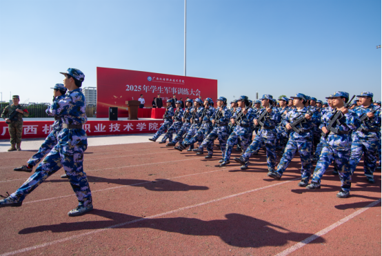 大会在庄严的国歌声中拉开帷幕。随着分列式进行曲激昂奏响,参训学生组成的分列式方队迈着铿锵有力的步伐,依次通过主席台接受检阅。同学们目光坚毅、口号嘹亮、动作整齐划一,充分展现了2025级学子经过汗水洗礼后焕然一新的精神风貌和严明的组织纪律。