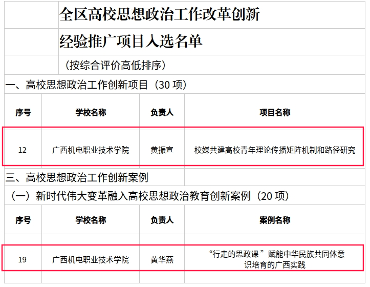 此次入选的两项成果各有侧重、特色鲜明。其中,《校媒共建高校青年理论传播矩阵机制和路径研究》聚焦校媒协同育人关键环节,深度探索青年理论传播的创新机制与实践路径,通过整合校媒资源、搭建传播平台,助力青年群体筑牢思想根基,成功入选“高校思想政治工作创新项目”;《“行走的思政课”赋能中华民族共同体意识培育的广西实践》立足广西边疆民族地区地域优势,将实践教学与中华民族共同体意识培育深度融合,以沉浸式、体验式教学增强思政教育实效,入选“新时代伟大变革融入高校思想政治教育创新案例”。