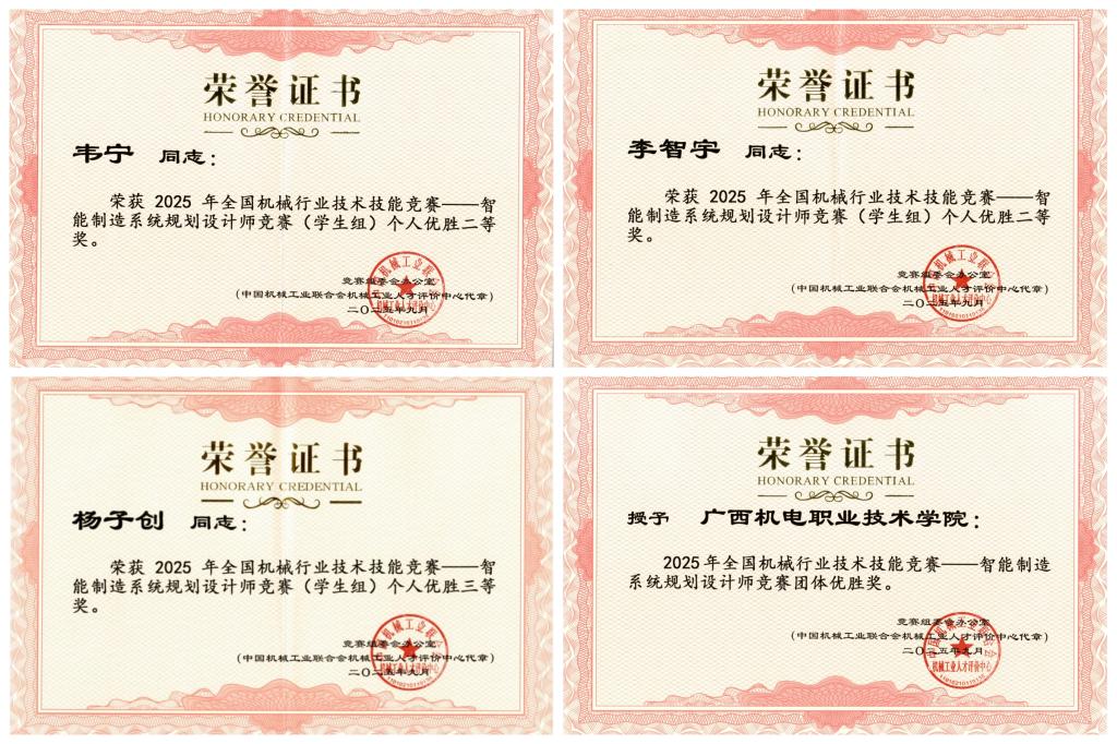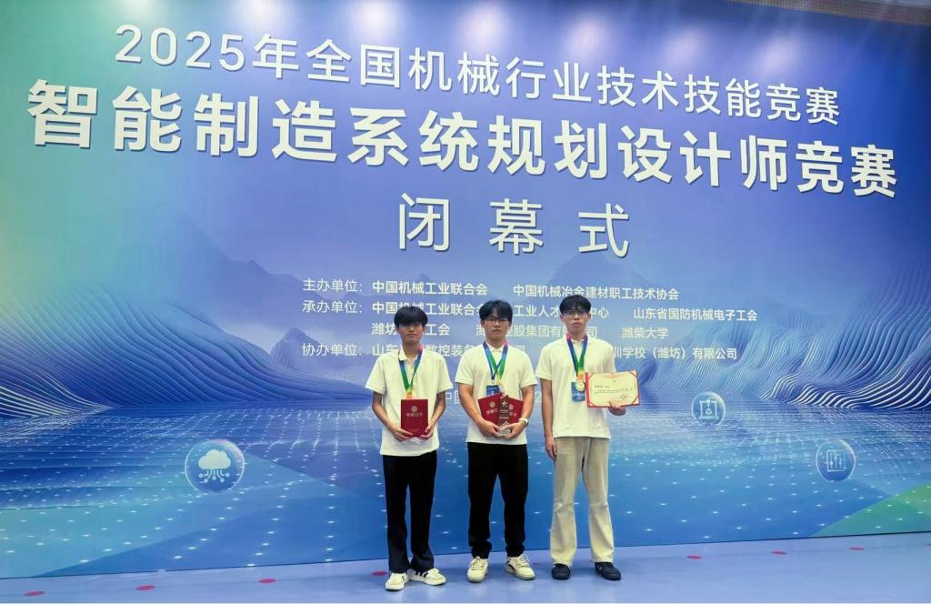 在2025年全国机械行业技术技能竞赛中,杨子创、韦宁和李智宇同学代表学院参加智能制造系统规划设计师赛项。最终斩获二等奖2项,三等奖1项,与此同时,学校因参赛团队的整体优异表现被授予团体优胜奖,充分展现了taptap官网在技能人才培养方面的扎实功底与团队建设的显著成效。