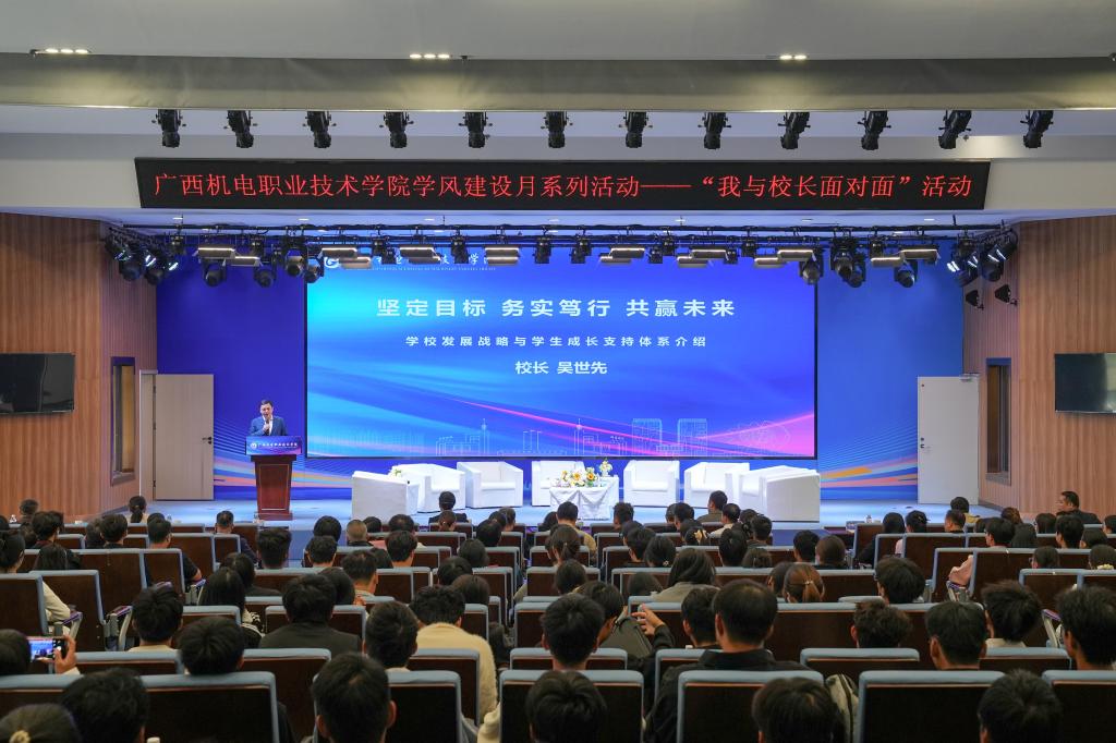 在专题讲座环节,吴世先校长以《坚定目标务实笃行共赢未来》为主题,深入剖析“学风”的时代内涵,将学校实现“广西领先、国内一流、国际知名、高水平智能制造特色校”目标、实施“11159”发展战略、学生成长支持体系向同学们逐一进行了细致解读与阐释。他鼓励同学们要珍惜在校时光,勤奋学习,将个人梦想与学校发展、区域经济发展、国家需求紧密结合,共同书写机电学院的辉煌。