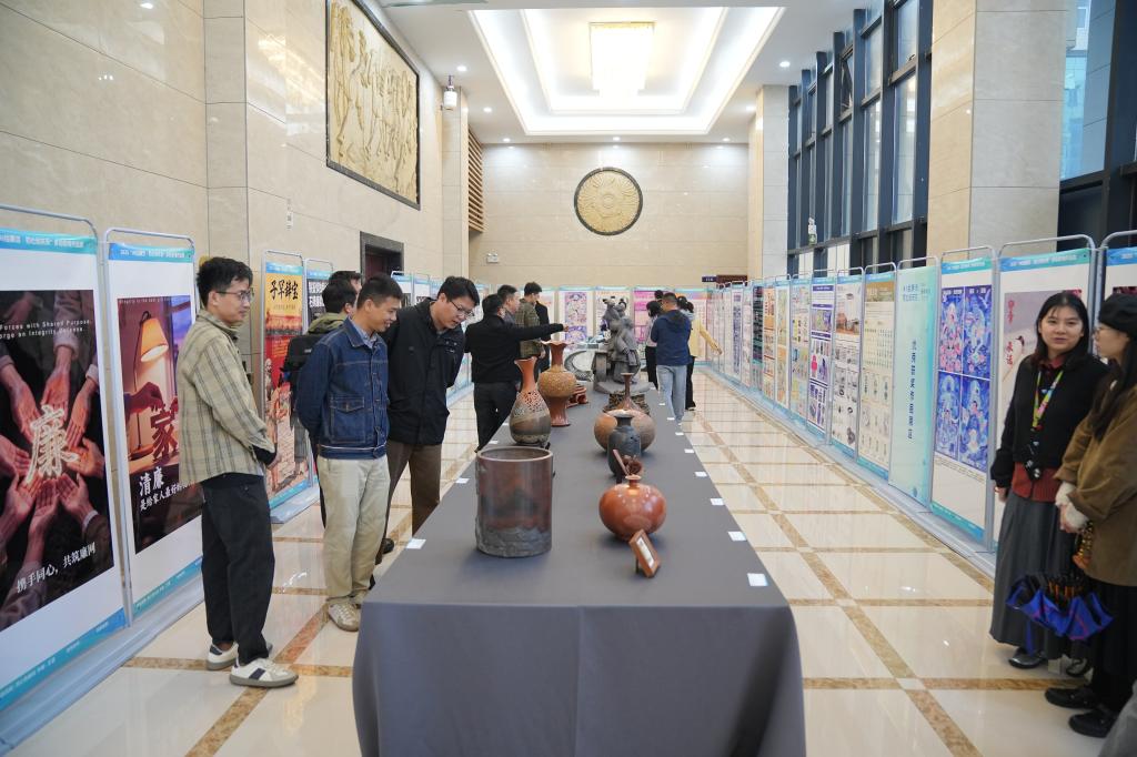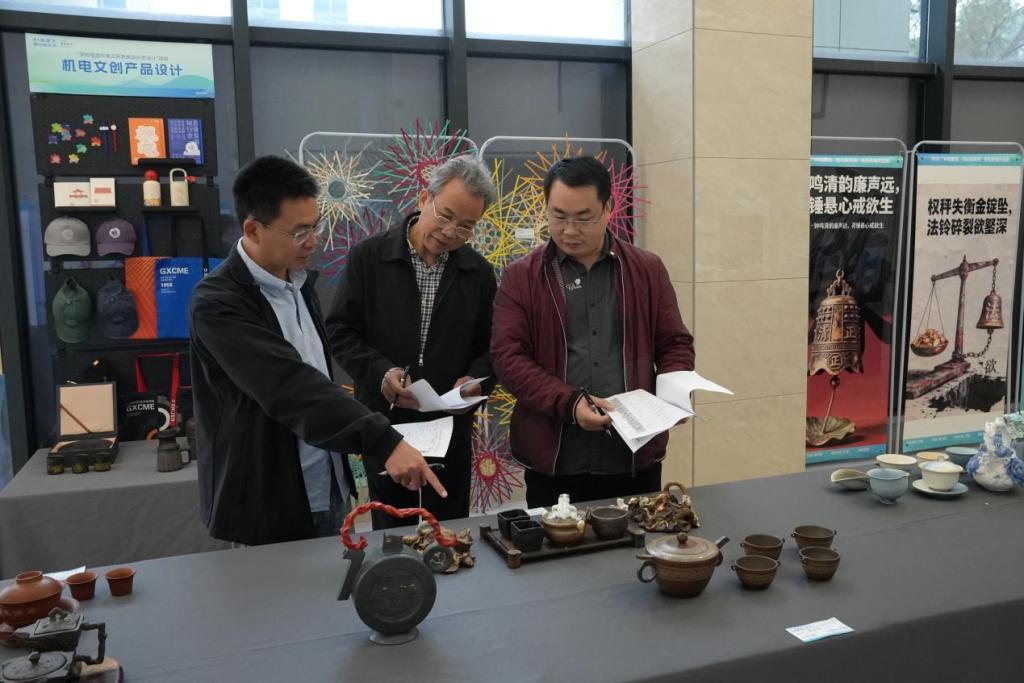 展览主要划分为“传统工艺廉洁呈现展区”“现代创意廉洁诠释展区”“优秀获奖作品展区”“机电文创产品设计”四大展区,系统呈现了廉洁主题在工艺美术与数字技术领域的多元表达,以及机电学子在相关专业领域的创新实践成果。