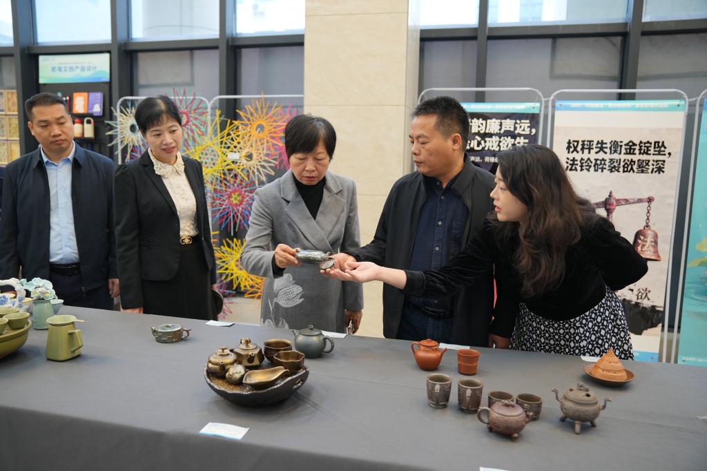 其中,“传统工艺廉洁呈现展区”以坭兴陶、木雕等传统工艺为载体,通过器物造型、纹样象征与工艺美学,生动刻画廉洁精神,彰显了廉洁文化深厚的历史底蕴与鲜明的地域特色。“现代创意廉洁诠释展区”则集中展示了一批运用AI技术生成的廉洁主题海报,通过算法设计与视觉艺术,以富有时代感的视觉语言传递崇廉尚洁、正道直行的价值理念。