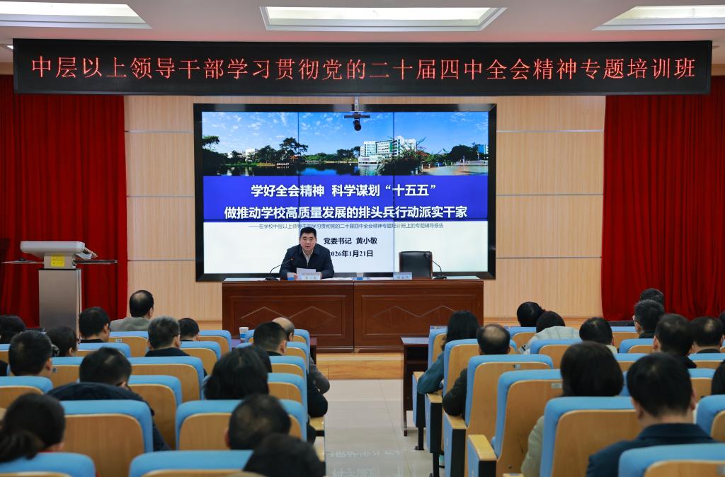 1月21日至23日,学校中层以上领导干部学习贯彻党的二十届四中全会精神专题培训班在相思湖校区举办。学校党委书记黄小敬出席开班式并作专题辅导报告,学校党委副书记、校长吴世先作专题辅导报告并在结业式上作总结讲话,学校党委副书记程云燕主持开班式和结业式。学校领导、全体中层干部参加培训。