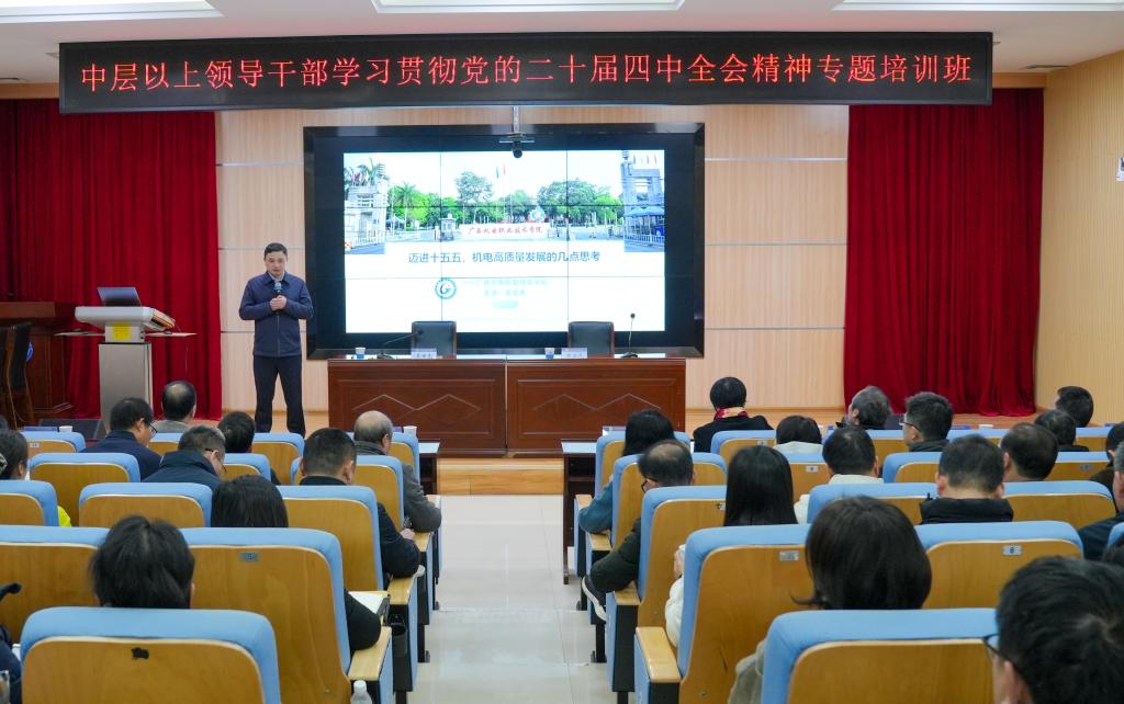 吴世先以《迈进“十五五” 机电高质量发展的几点思考》为题作专题辅导报告。他从“规划的意义”“面临的问题”“机电的战场”“我们的使命”四个方面对贯彻落实党的二十届四中全会精神、谋划“十五五”、建双高升职本重点任务进行了深入的阐述,强调要把握新时代国家、区域、职业教育发展的“时”与“势”,抢抓国家大力发展先进制造业、广西全力打造制造业十大支柱产业对高技能人才的迫切需求,为学校高水平智能制造特色校建设提供的战略机遇,进一步强化责任担当、精准发力,谋划好“建双高 升职本”核心指标和重点任务,用好抓工作落实“543”体系,真抓实干、攻坚克难,以时不我待的劲头抓好学校“十五五”规划编制各项工作落实。