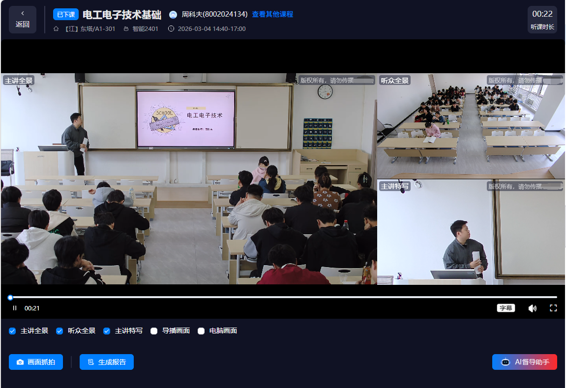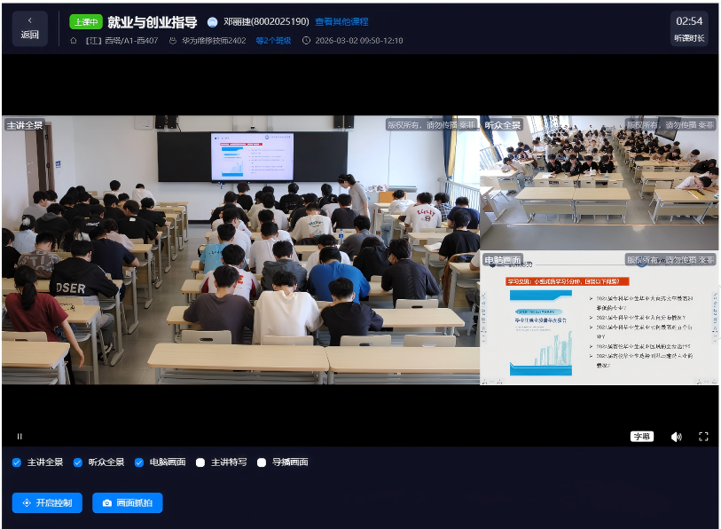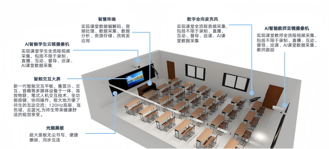 AI智慧教学空间建设同步融入智能督导功能,依托标准化巡查管理软件与智能课堂摄像机,实现对课堂教学过程的实时监测、动态分析与科学评估,进一步规范教学行为、优化教学过程,为教学质量提升提供精准保障。