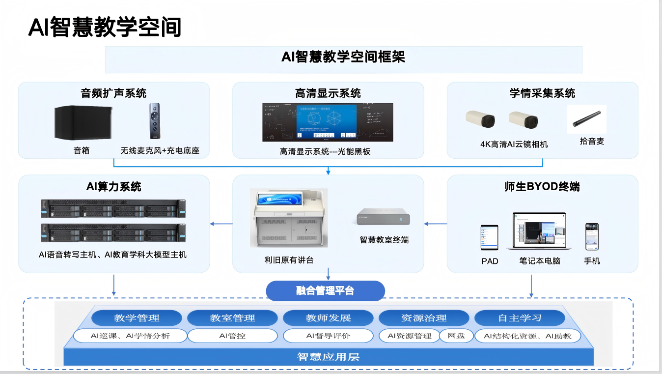 本次AI智慧教学空间建设以“赋能教学、提质增效”为目标,重点推进智能应用系统本地化部署与教学环境升级改造。在系统建设方面,taptap官网同步部署了AI教育学科大模型系统、AI语音转写系统、融合管理平台、标准化巡查管理软件等一系列智能应用,构建起全方位、智能化的教学管理体系,为教学活动开展提供高效技术支撑;在硬件升级方面,通过为每间教室配备交互式智能一体机、智慧教室终端、智能课堂摄像机等设备,全面升级改造传统多媒体教室,进一步优化课堂教学环境,助力构建更加高效、便捷、互动的数字化教学生态。