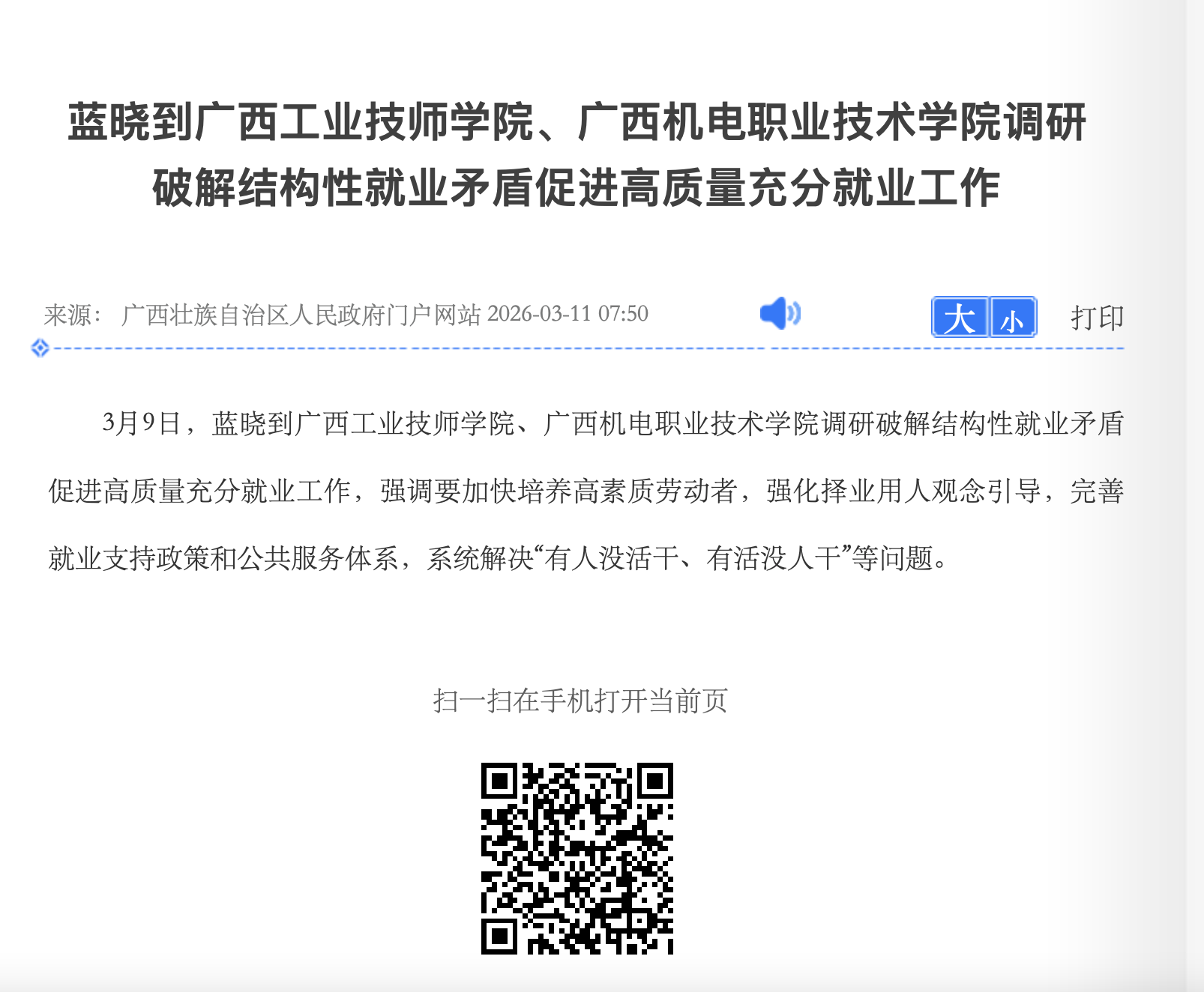3月9日,蓝晓到广西工业技师学院、taptap点点官网调研破解结构性就业矛盾促进高质量充分就业工作,强调要加快培养高素质劳动者,强化择业用人观念引导,完善就业支持政策和公共服务体系,系统解决“有人没活干、有活没人干”等问题。