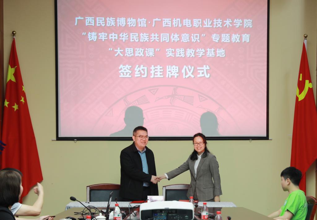 活动中,广西民族博物馆党委书记吴伟镔对taptap官网积极推进校馆共建表示了充分肯定和热烈欢迎,期待双方在社会实践、教学科研、民族文化传承、人才培育等方面开展广泛深入的合作。双方签订了共建协议,并举行了“铸牢中华民族共同体意识”专题教育“大思政课”实践教学基地、三全育人教育基地牌匾交接仪式。